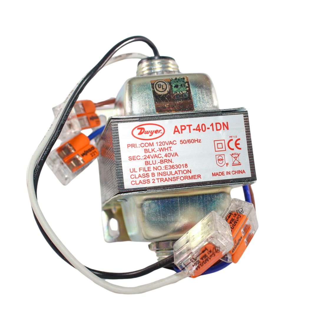 Transformador de AC, entrada de 120V AC, salida de 24V AC, clasificación 40 VA, centro dual, cable de 8.5 ft, fusible interno. Marca Dwyer