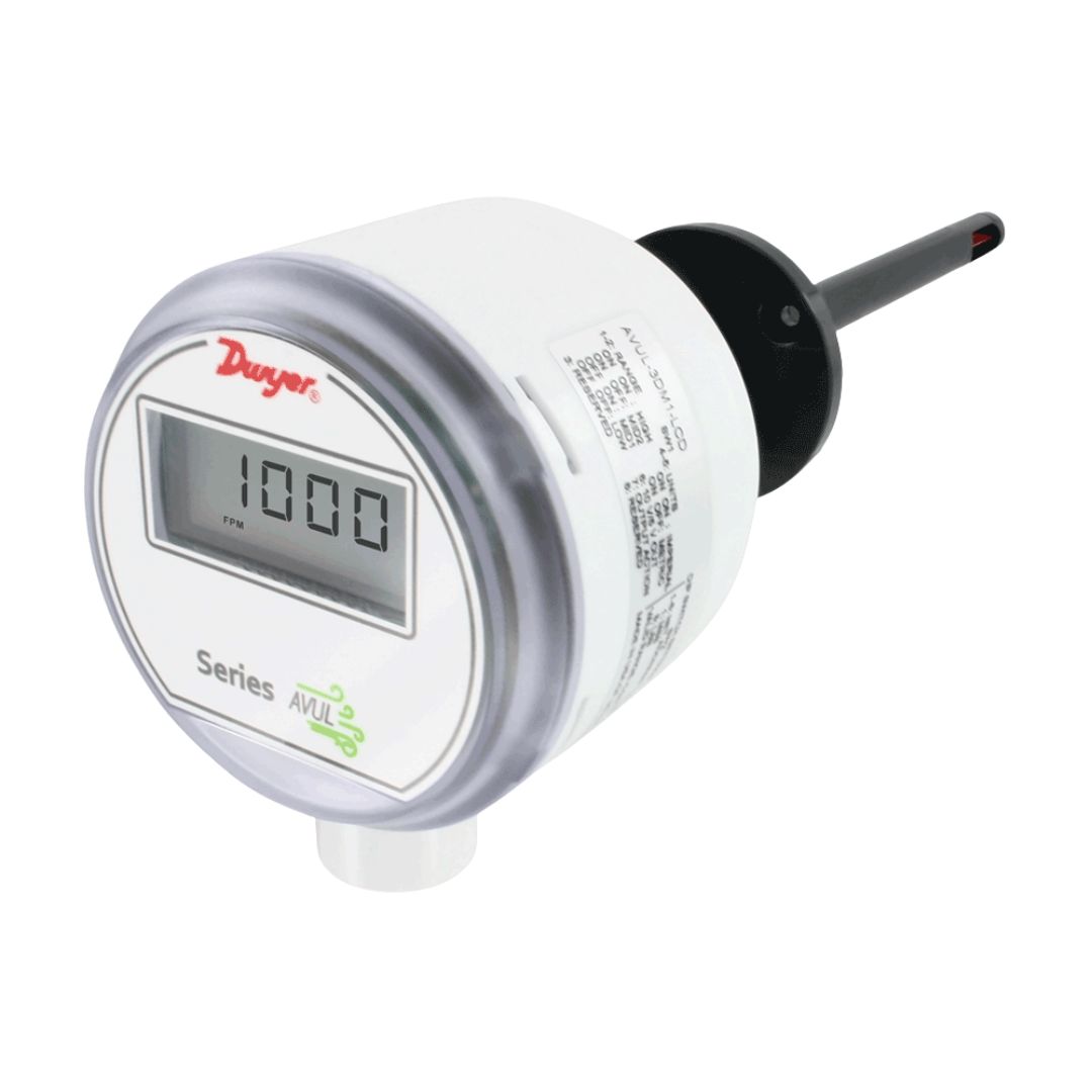Transmisor de velocidad de aire, exactitud 3%, montaje en ducto, salida universal de corriente o voltaje 4-20 mA, 0-5 VDC, 0-10 VDC, rango seleccionable 1000, 2000, 3000, 4000 PPM (5, 10, 15, 20 m/s), alimentación 24 VDC ±20% o 24 VAC ±20%, ajuste de Zero & Span por boton digital, resistencia de carga de salida de Corriente: 0 to 1100 Ω max.; salida de Voltaje: Minimo 1 k Ω, consumo de corriente maximo 60mA, display LCD de 5 digitos, NEMA 4X (IP66), aprovaciones BTL y CE. Marca Dwyer