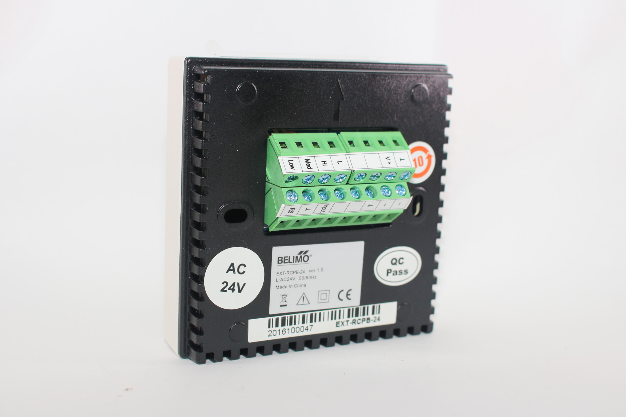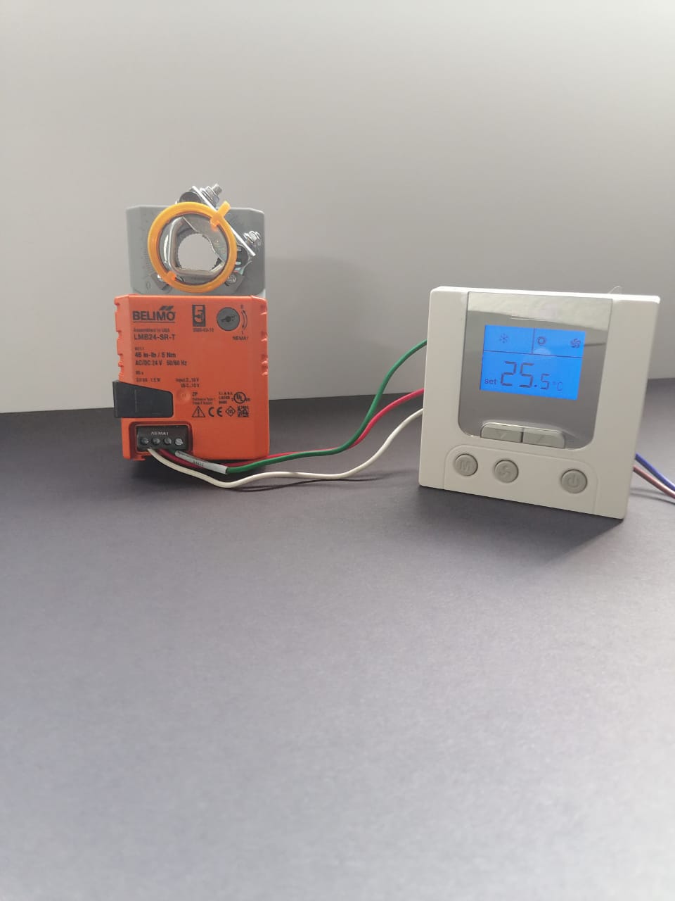 Termostato de señal de control proporcional, salida 0-10VDC, modo solo enfriamiento o solo calefacción, 1 a 3 velocidades del ventilador, opcion de sensor remoto, alimentación 24vac, pantalla enciende en color azul. Marca Belimo